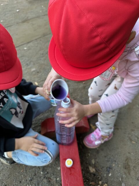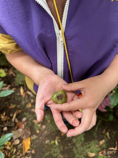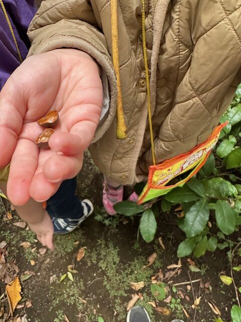 幼稚園の園庭では落ち葉、木の実など秋がたくさん見つかります。榊の実を使って様々なあそびが始まりました。
